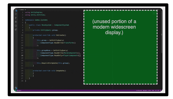 The plain text file format can only provide a single, vertical column of information. Contrast this with a magazine or newspaper layout in which there are multiple columns. In the usual case, half of the widescreen display is completely wasted during editing of a code file: